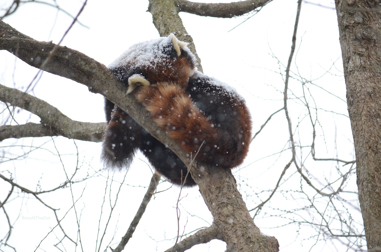 Red panda. This could be Kora, the mom; Kora spends a lot of time in a tree. I found that a camera's autofocus might not work well when it's snowing.